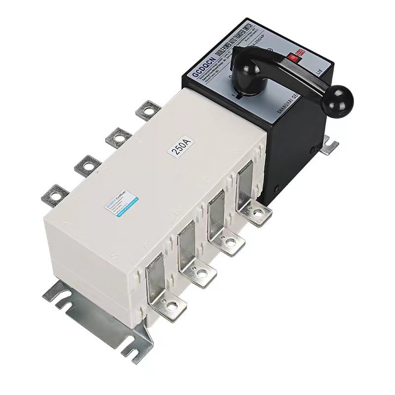 Bộ chuyển đổi hai nguồn điện ats 3 pha 250A dùng để chuyển đổi nguồn điện cấp vào công trình từ điện lưới sang máy phát điện khi nguồn điện lưới gặp sự cố hoặc mất điện và ngược lại khi nguồn điện lưới ổn định hoặc có điện trở lại thiết bị có chức năng chuyển nguồn điện cấp cho công trình sang nguồn điện lưới. tất cả các thao tác trên hoàn toàn tự động đảm bảo an toàn chính xác.