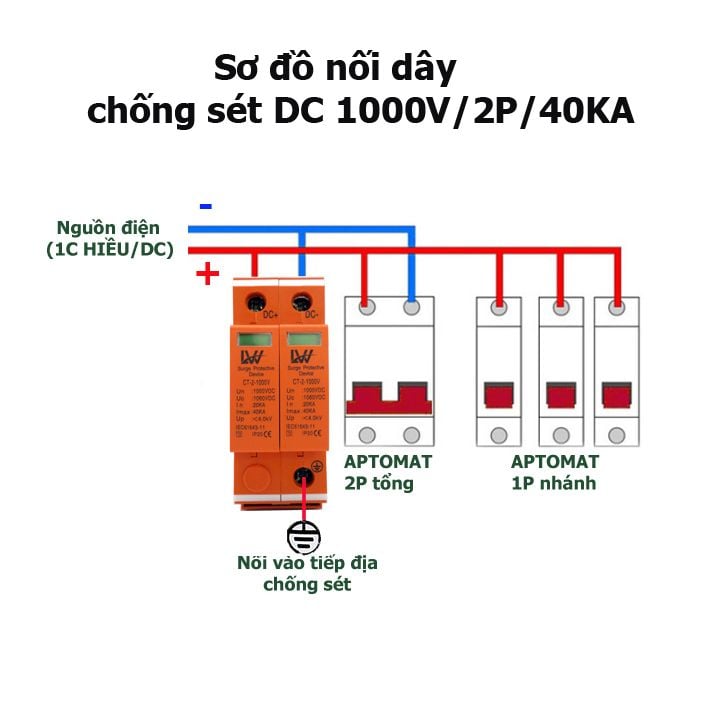 Thiết bị chống sét lan truyền DC 1000V 2P/40KA bảo vệ chống sét năng lượng mặt trời