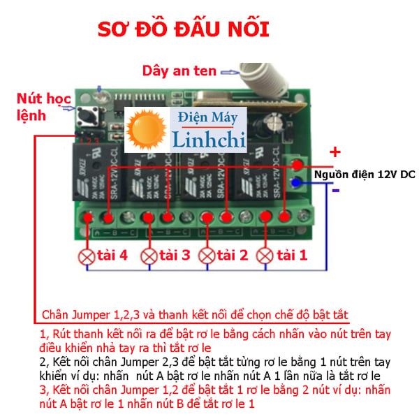 - dùng để bật tắt 4 thiết bị điện 1 chiều 12V DC riêng biệt từ xa không dây