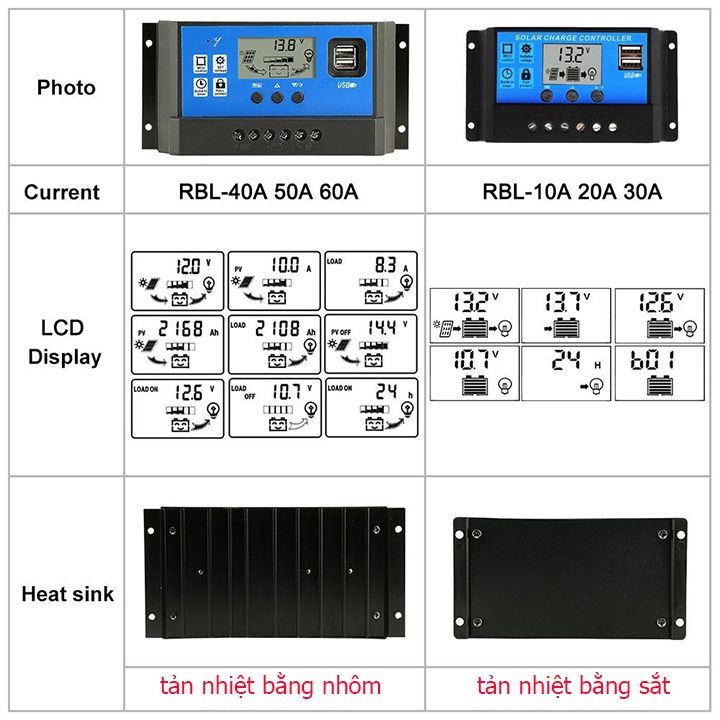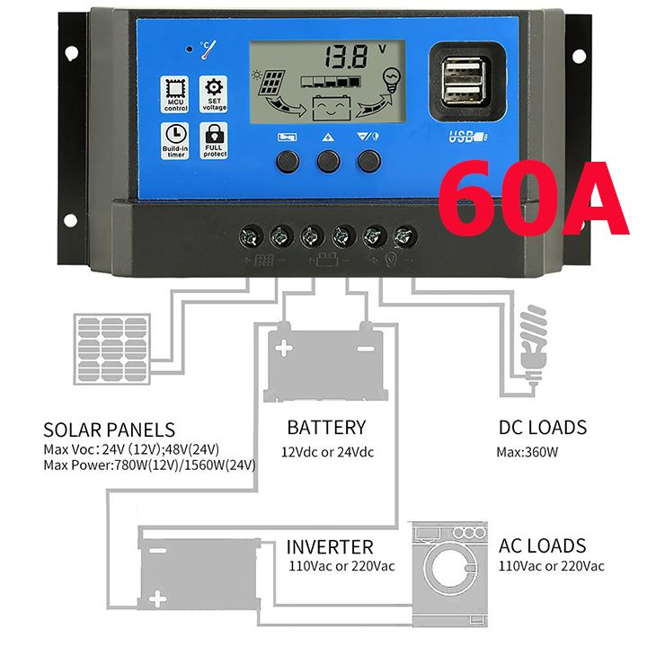 - Điều khiển sạc năng lượng mặt trời, 12/24V/60A, có màn hình LCD hiển thị, có ngõ ra 2 USB sạc điện thoại di động