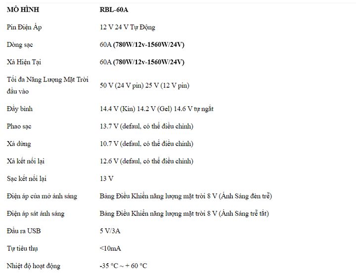 - Dòng sạc 60A/ xả tương đương 1440W/24V