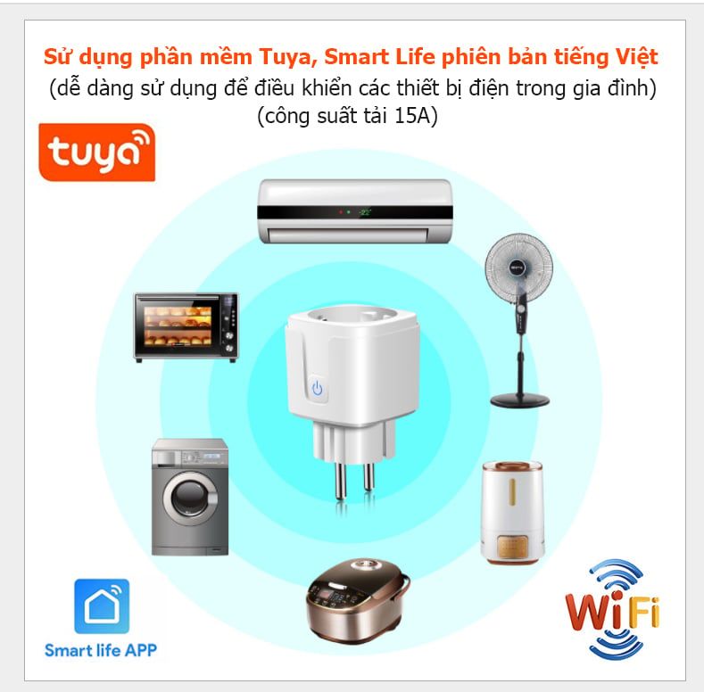 Ổ Cắm Wifi Điều Khiển Từ Xa qua điện thoại sử dụng phần mềm bản tiếng Việt có thể sử dụng phần mềm Smart life hoặc Tuya dùng để điều khiển từ xa các thiết bị điện từ xa qua sóng Wifi, 3g 4g.