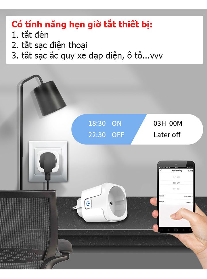 - Bạn có thể điều khiển bật/tắt và hẹn giờ mọi thiết bị cắm vào ổ cắm thông minh như hẹn giờ nồi cơm điện, bật tắt đèn, bật tắt sạc điện thoại, TV, quạt…