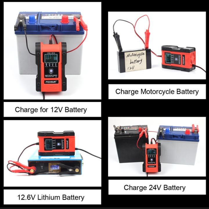 Sạc ắc quy 12V 24V 150AH FOXSUR sạc được pin Lithium LiFePo4 có chức năng khử sunfat thông minh tự ngắt khi đầy